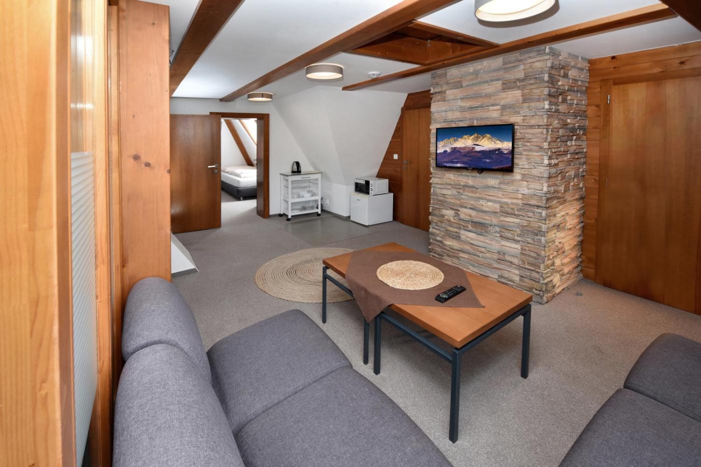 Štúdio. The studio offers a carpeted floor and heating, as well as a private bathroom boasting a shower. The spacious studio features a seating area, a wardrobe, an electric kettle, a flat-screen TV with cable channels, as well as garden views. The unit has 6 beds. ;